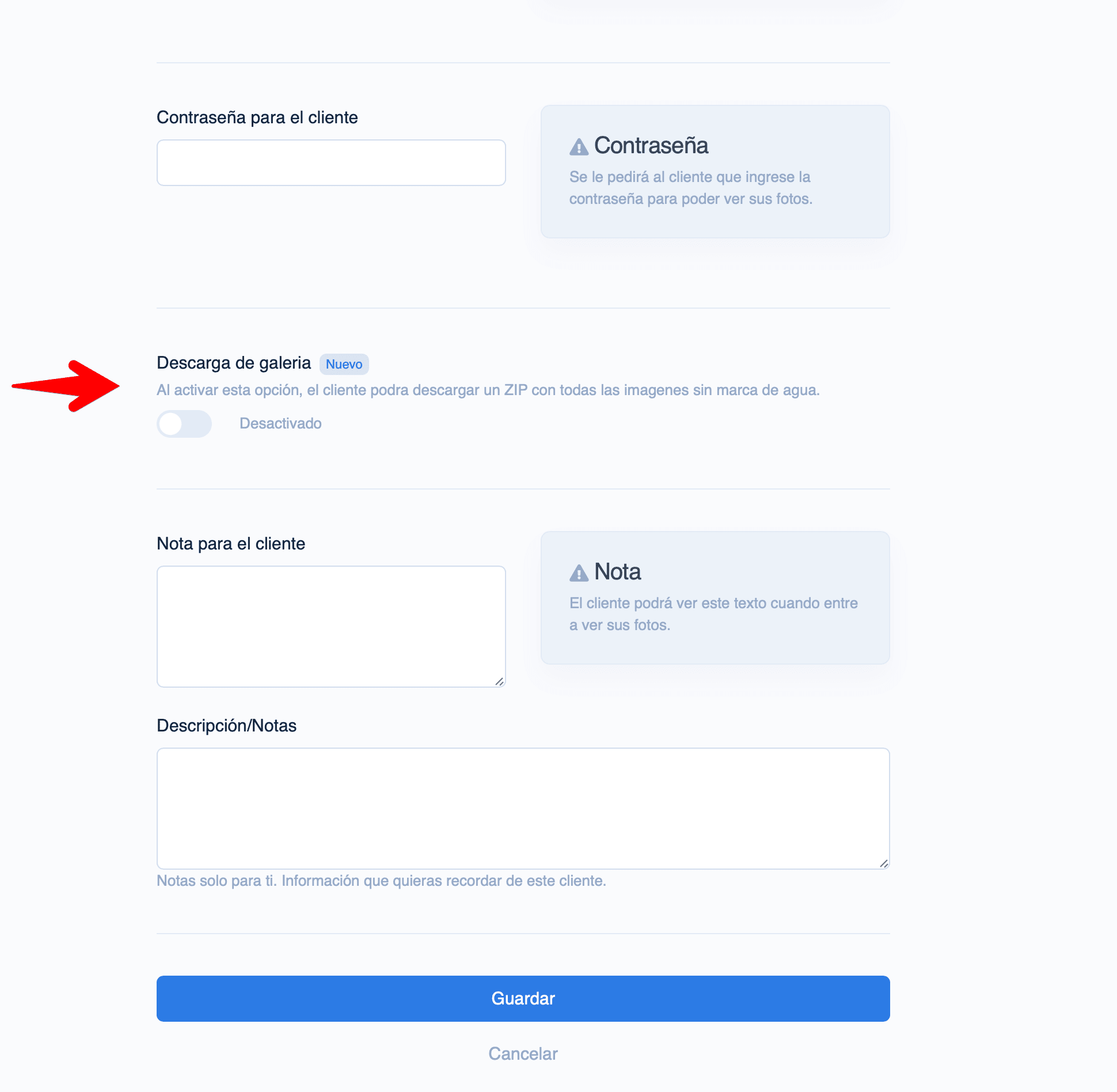 Notas por imagen. Pro Agrega comentarios a cada foto para comunicarte con tu cliente directamente en la galería. Tanto el fotógrafo como el cliente pueden dejar notas, ideales para indicar retoques o preferencias. Más información →